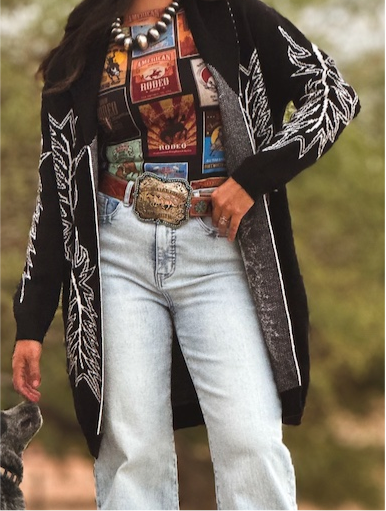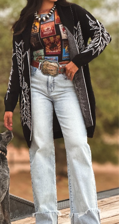 Wrap yourself in western Elegance with this Black Boot Stitch Embroidered Open-Front Knit Cardigan - The rich black color exudes rustic elegance, while side pockets add practical flair. It’s a perfect layering piece for chilly rodeo nights, NFR Rodeo week, or everyday coffee runs.