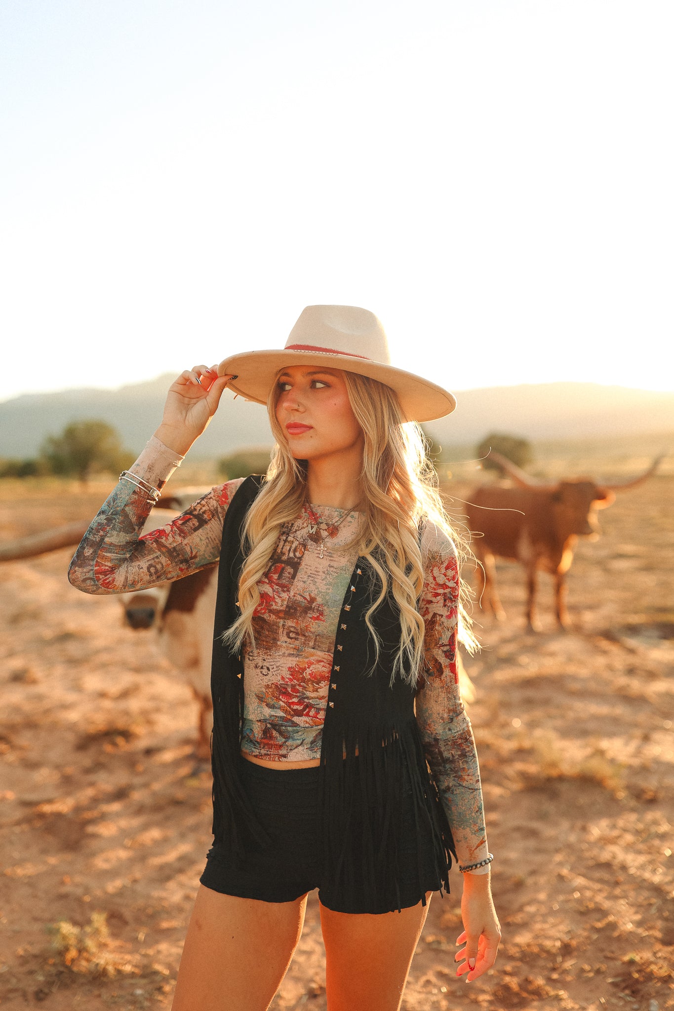 Black women's sleeveless fringe vest. Stunning, bold and completely fun.