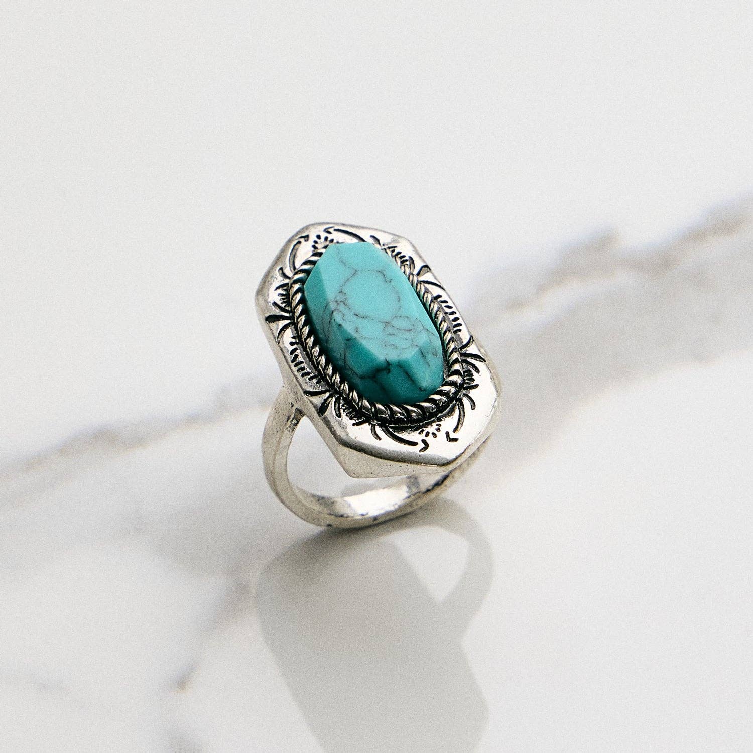 This silver-tone ring features a semi-precious natural turquoise stone framed in a detailed etched setting. The engraved design and rope-style bezel add Western charm and vintage appeal. Perfect for daily wear or stacking with other boho favorites.