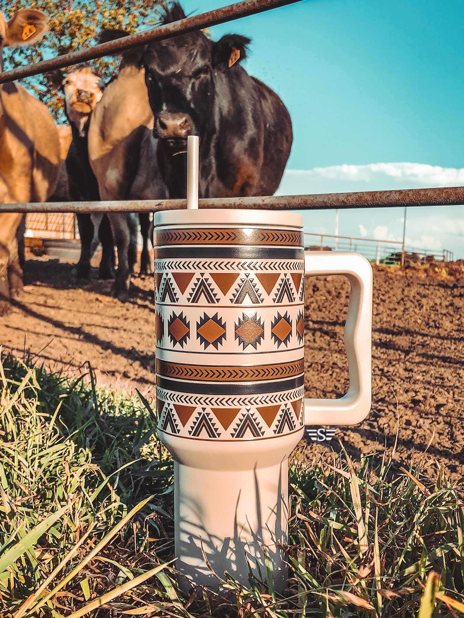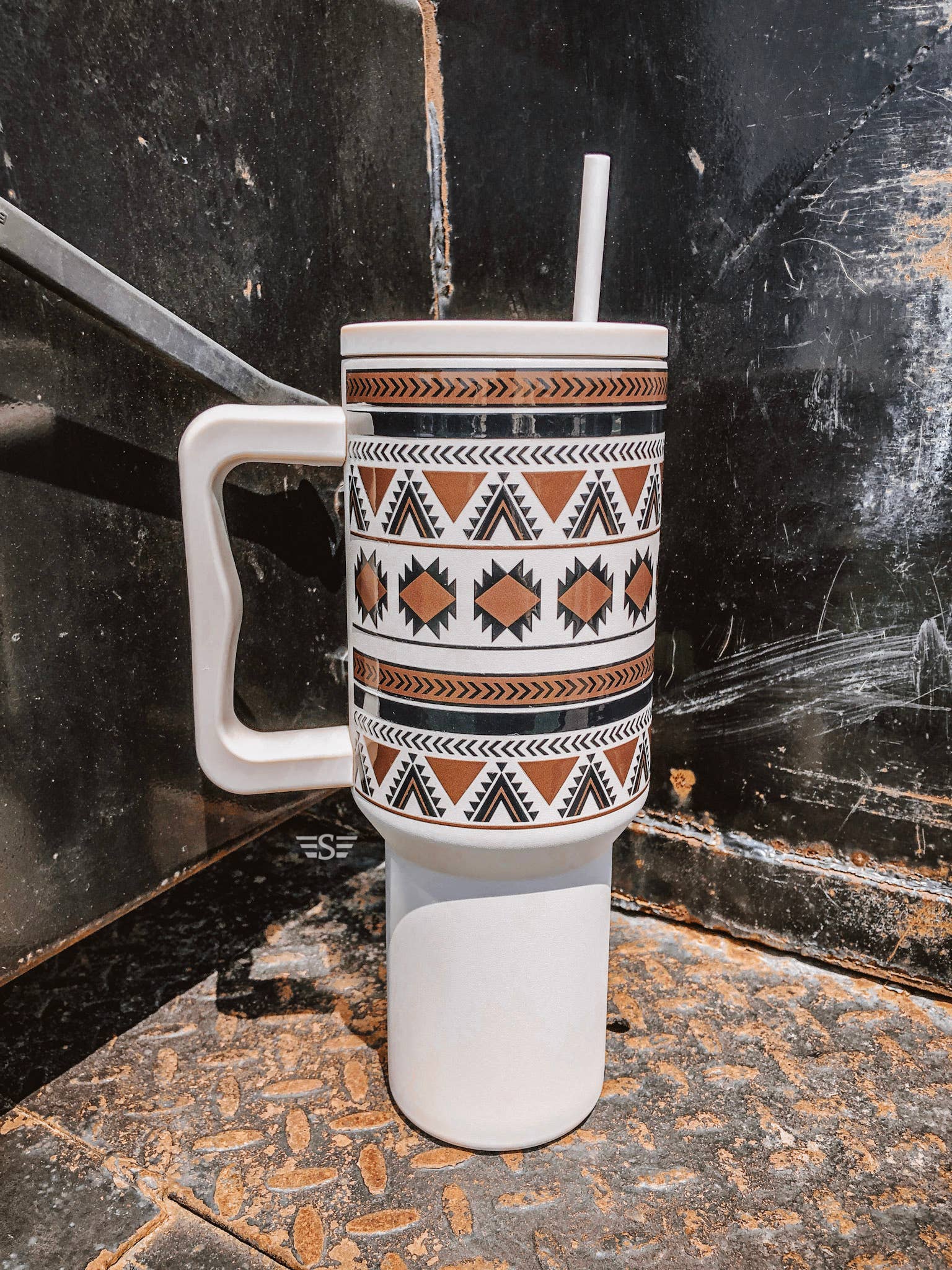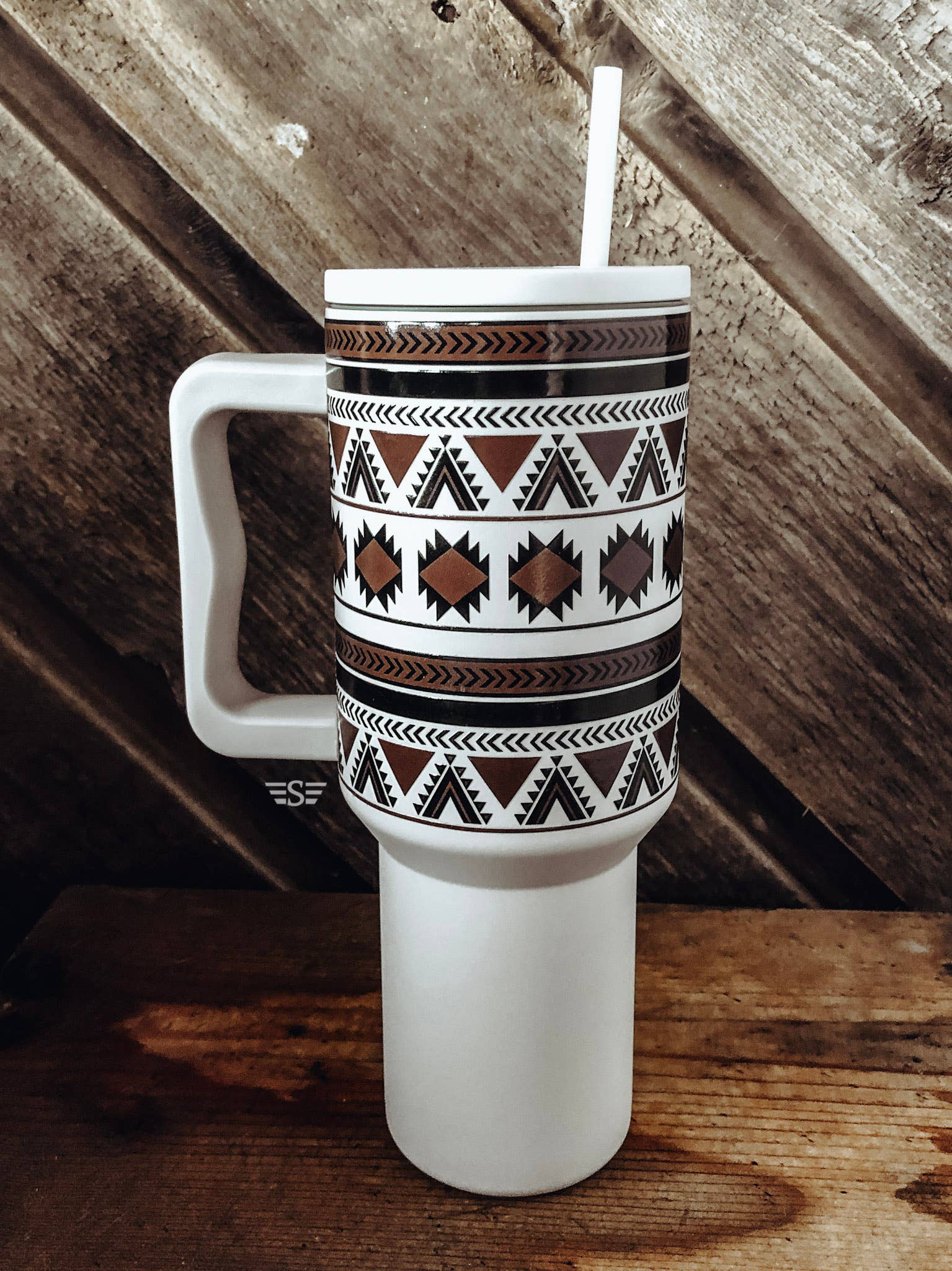 Earthy aztec tones on this sleek 40z insulated cups! You won't see these cups leaking, these seal up when tightened and are perfect for those on the go! Swap the lid direction for a left or right handed cup!